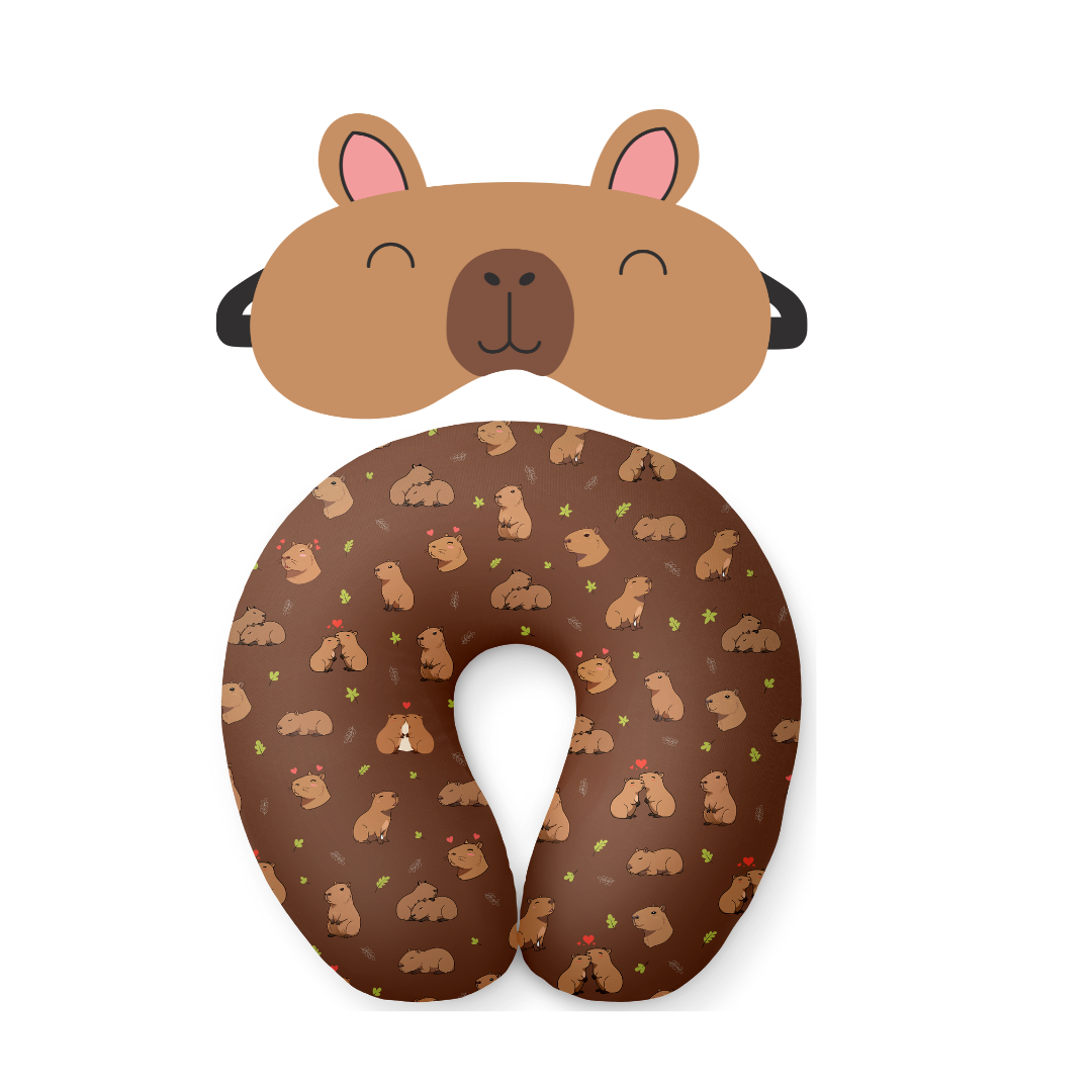 Kit Viajem Capivara | Almofada de Pescoço + Máscara de Dormir – Macio, Fofo e Divertido